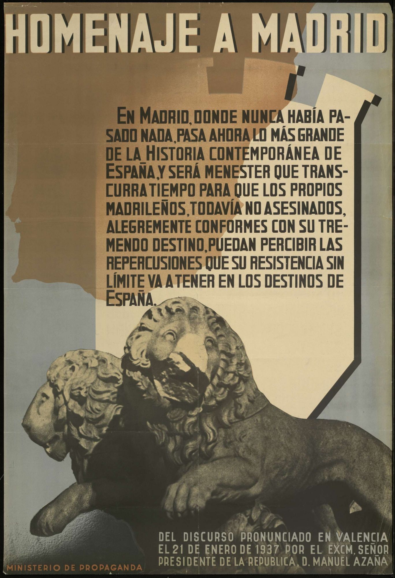 Le Président de la République Manuel Azaňa lui rend hommage, à Valence, le 21 janvier 1937. L’héroïque défense de Madrid soulève admiration et solidarité dans le monde entier.