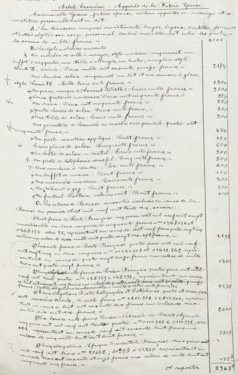 Car c’est bien de la protection des biens dont il s’agit. Les 24 contrats de mariage sont avant tout une liste de biens (figure 2). Le notaire détaille le contenu du trousseau de l’épouse - les “vêtements, linges, bijoux, dentelles, fourrures, et autres objets à usage personnel” [5] -, il liste les mobiliers apportés par les deux époux, il nomme les valeurs en bourse et les propriétés immobilières. Cette longue énumération permet aux fiancé.es, et surtout à la femme, de connaître les biens de l’autre et de protéger les siens. Cette description précise de la valeur monétaire des biens est ce qui garantit une reconnaissance de propriété en cas de dissolution de mariage.
