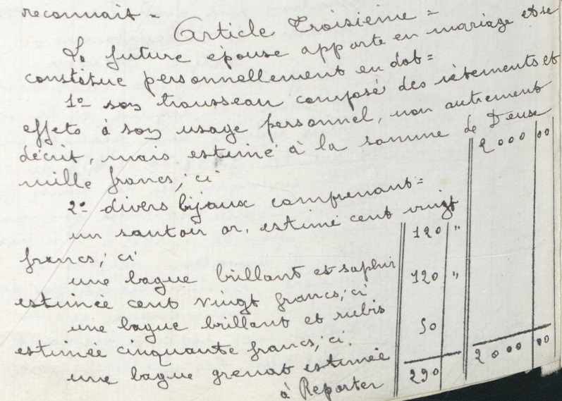 Des notaires détaillent avec une précision parfois extrême les biens propres de l’épouse, le plus souvent quand ces biens ont une valeur élevée et que les parents sont présents. Dans le contrat de Jeanne Janiaut, dont les apports sont supérieurs à ceux de son époux de 47 224 anciens francs [16], le notaire détaille son mobilier en précisant la quantité, la matière et le style de chaque meuble (figure 3). De plus, les caractéristiques de ses bijoux sont détaillées en dehors du trousseau, à l’inverse de la majorité des contrats [17], ce qui peut permettre d’éviter les litiges ou les vols, surtout pour des objets si petits.