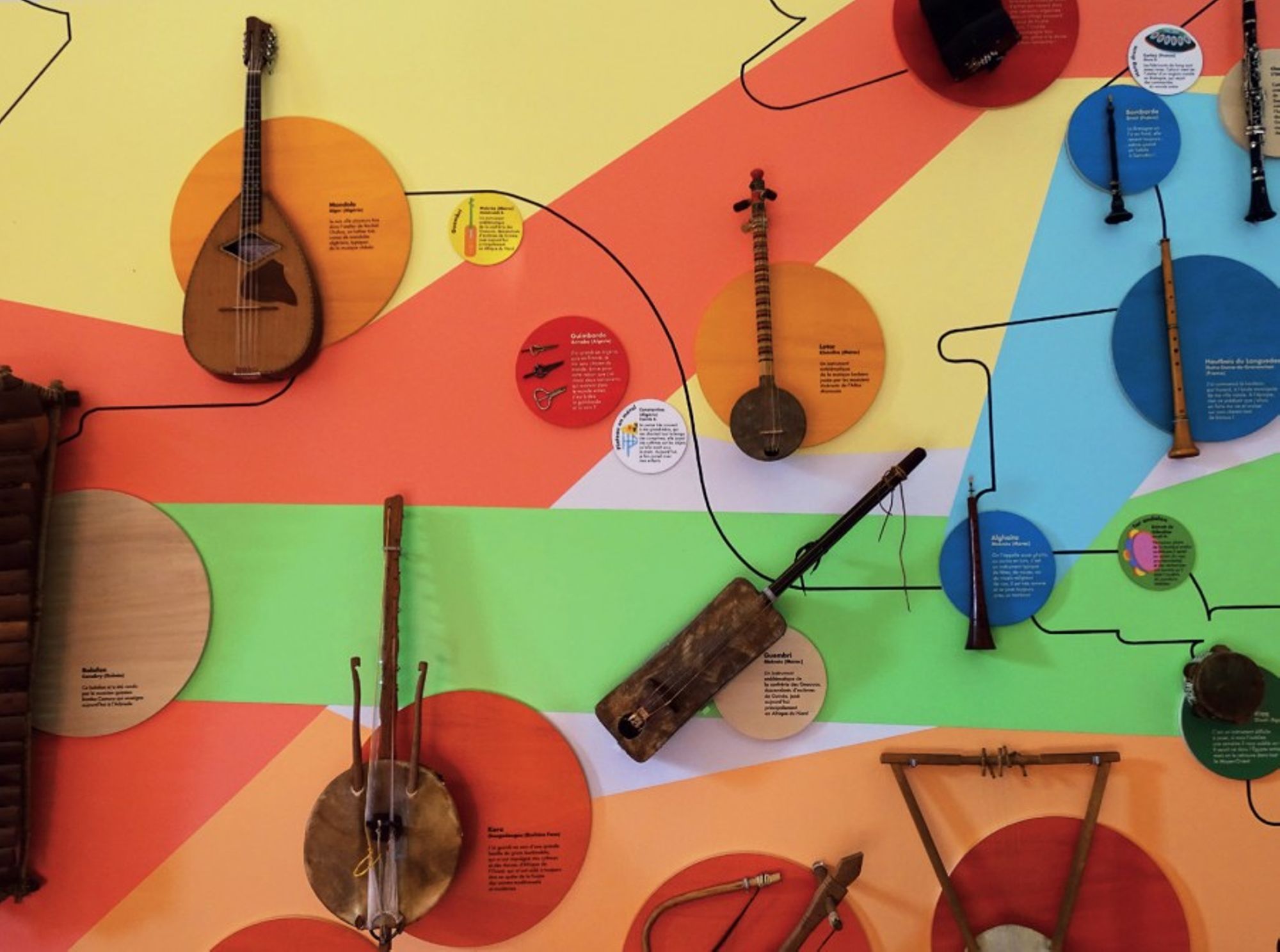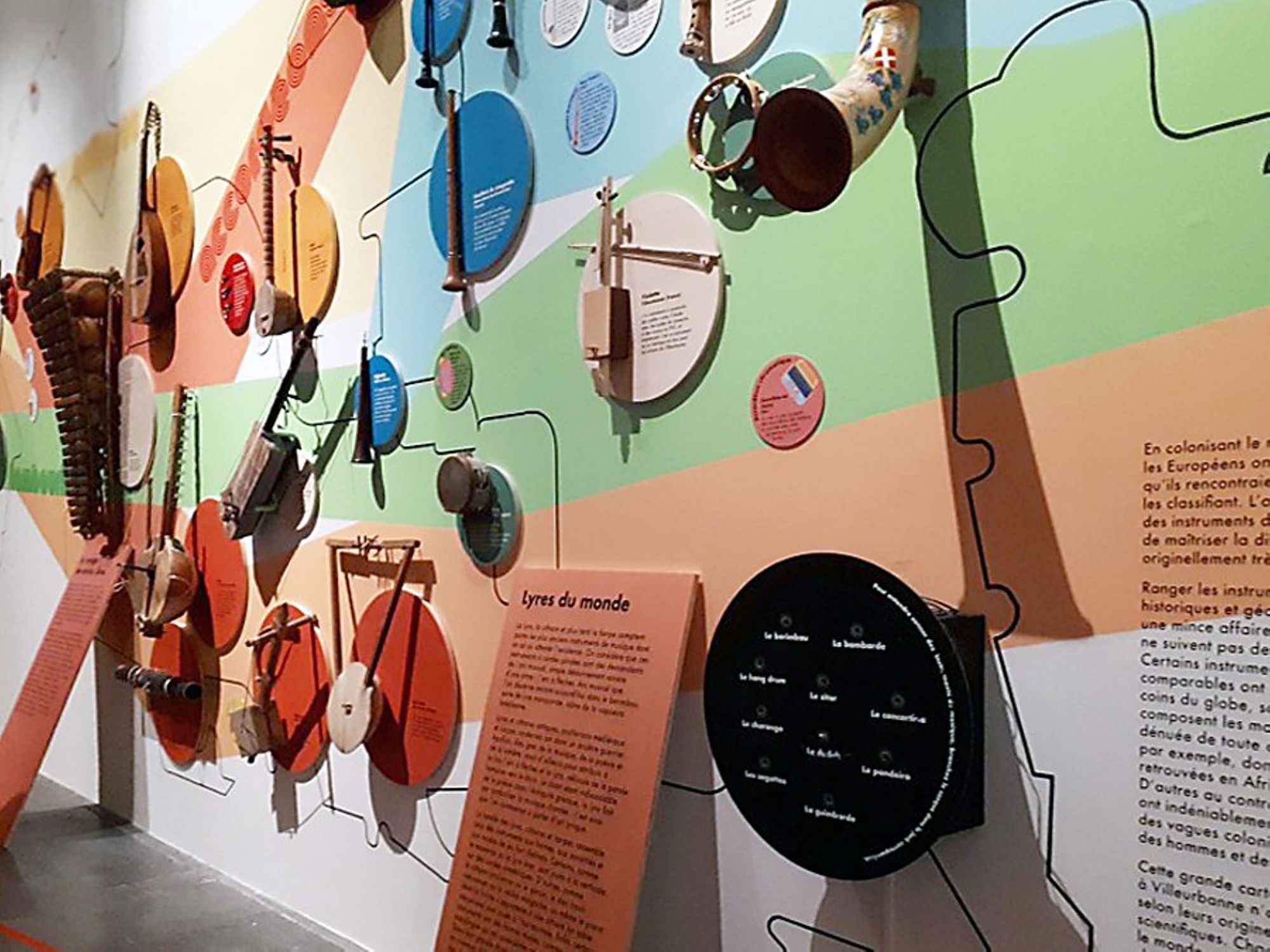 Cette grande carte des instruments de musique rencontrés à Villeurbanne n’a donc pas la prétention de les répartir selon leurs origines géographiques objectives, scientifiques. Chacun de ces objets a été localisé dans le monde selon son histoire individuelle, indissociable des voyages, des mémoires et des pratiques culturelles de leurs propriétaires. De même, les cinq faisceaux de couleurs qui traversent les continents ne sont pas à lire comme des classifications immuables, mais comme des cousinages, des résonances attestées ou mystérieuses. Ceci est une invitation à déchiffrer les musiques du monde avec les lunettes du mouvement des hommes, des hasards des rencontres et des emprunts culturels qui nous rappellent que les instruments de musique, tout comme les cultures, ne cessent de se réinventer.