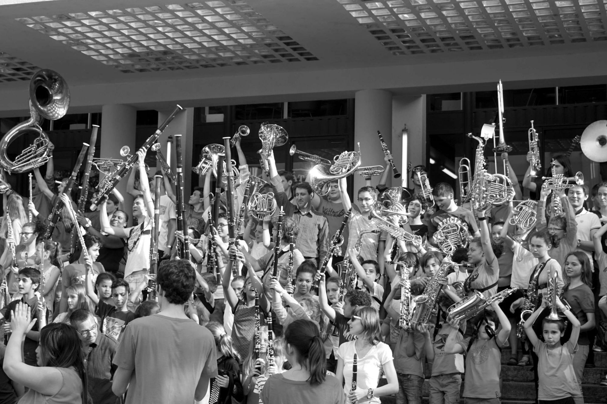 Que ce soit dans des cadres institutionnalisés et professionnels (programmation de cinémas, de cafés et guinguettes, de salles de concerts, enseignement dans des harmonies et écoles de musique…) ou lors de manifestations plus spontanées et amatrices, la fête de la musique étant au croisement des deux, les instruments de musique tendent à se regrouper en quatuors, big bands, batucadas, groupes, fanfares, crews, orchestres… et à réunir autour d’eux danseurs et auditeurs. Volontiers grégaires, les instruments de musique s’accordent, construisent l’espace public et rythment la vie de la cité. Comme en témoignent la demande croissante de pratique instrumentale et l’attractivité des concerts, l’instrument « vivant » et socialisé, y compris sous forme électronique, est encore loin d’être remisé par l’écoute musicale individuelle, aussi répandue soit elle.