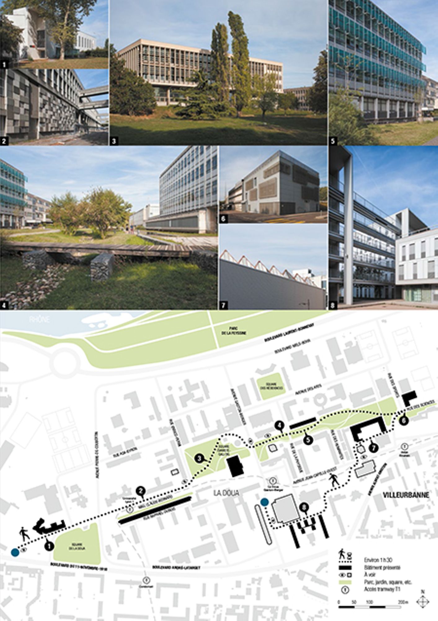 La Doua. Cette partie de Villeurbanne est connue de tous : c’est un campus. Que dire de plus qu’on ne sache déjà ? il s’agit pourtant d’un territoire à part, au développement et à la lecture plus complexes qu’on ne l’imagine. Des 9 quartiers identifiés à Villeurbanne, La Doua est le seul qui ne dispose pas de conseil de quartier, ni d’élu référent, … ni d’habitants permanents. Depuis le 19e siècle, des institutions se sont appropriées ces anciens prés communaux, par définition ouverts à tous, et les ont réservés à des usages bien spécifiques : caserne, hippodrome, nécropole, campus. Ce marquage d’une séparation entre La Doua et le reste de la ville a contribué à maintenir les Villeurbannais à distance, à la fois physiquement et psychologiquement. Ce territoire en marge s’est donc retrouvé à plusieurs reprises au cœur d’enjeux nationaux, voire internationaux, tout en étant peu ou peu connu de ses riverains les plus proches.