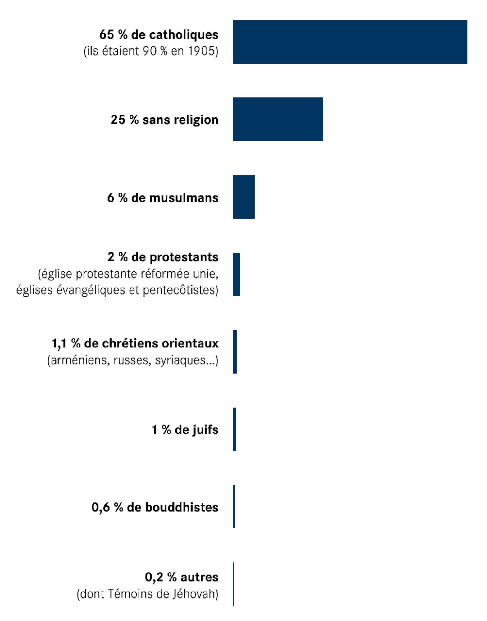 Il n’existe pas de statistiques officielles recensant l’appartenance confessionnelle des Français, mais on dispose d’estimations sur l’appartenance religieuse déclarée (pratiquants occasionnels ou non pratiquants se réclamant d’une culture religieuse). Les chiffres sont assez variables selon l’origine des études : INED, INSEE, Bureau central des cultes du Ministère de l’Intérieur, instituts de sondage pour la presse nationale. Ce graphique ne donne qu’un ordre de grandeur. On remarquera que la France est le pays européen qui compte le plus grand nombre de musulmans, de juifs et de bouddhistes.