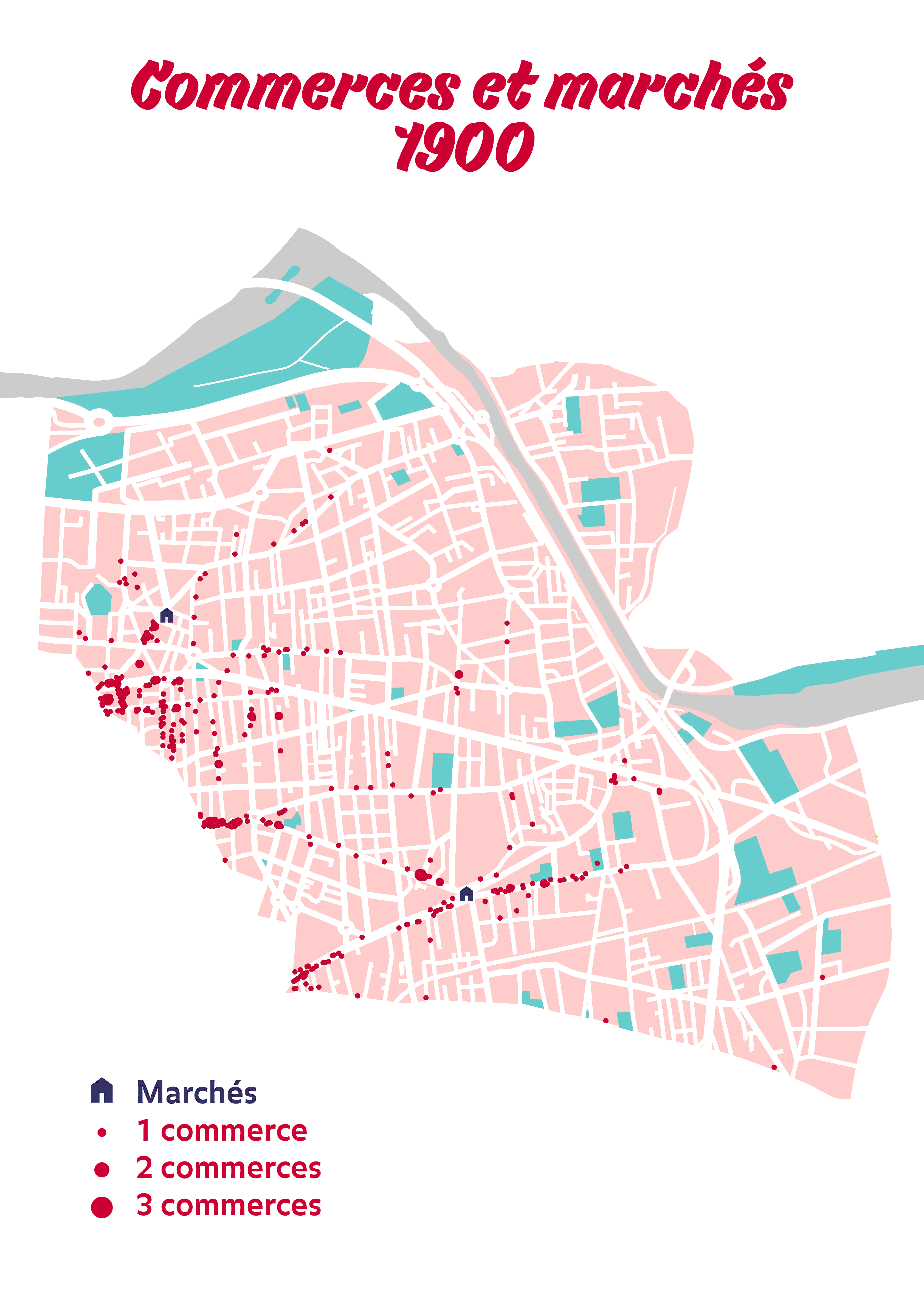 Au XIXème siècle, les quartiers situés à proximité de Lyon s’industrialisent et s’urbanisent en premier. Il s’y développe en plus grand nombre des activités commerçantes. Aujourd’hui cette configuration demeure : les secteurs situés à l’ouest de Villeurbanne sont davantage pourvus en commerces que ceux situés à l’est. Le développement commerçant et marchand s’effectue aussi au fil des déplacements successifs de la Mairie : d’abord située à Cusset, puis à Grandclément, et enfin aux Gratte-Ciel.