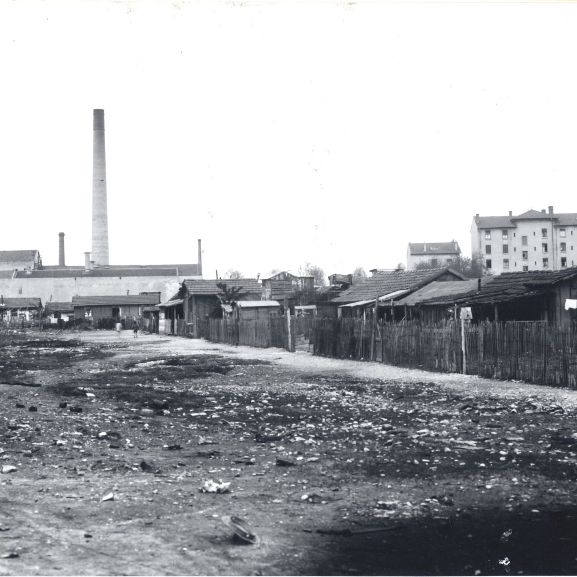 L’offre de logements n’est alors pas assez satisfaisante pour accueillir cette vague d’immigration et le problème de l’habitat précaire perdure : des bidonvilles accueillent progressivement des familles immigrées dans les années 1950 et 1960, surtout maghrébines, c’est le cas du bidonville des Buers ou de celui du Chaâba. L’histoire des immigrés algériens a marqué d’une façon singulière le territoire national comme villeurbannais : par les mobilisations en faveur d’une Algérie indépendante représentée par Messali Hadj[9] qui tient en 1935 un meeting au Palais du travail de Villeurbanne en appui aux militants locaux ; par la Guerre d’Algérie en 1954 et une indépendance finalement acquise en 1962. Elle précède une installation des migrants qui s’amplifie alors avec un nombre croissant de familles. Un certain nombre d’entre elles trouve résidence dans des grands ensembles, comme dans la cité Olivier de Serres qui, par une concentration progressive de populations immigrées du Maghreb et la marginalisation qui en a découlé, résonne encore aujourd’hui comme un échec urbanistique et social.