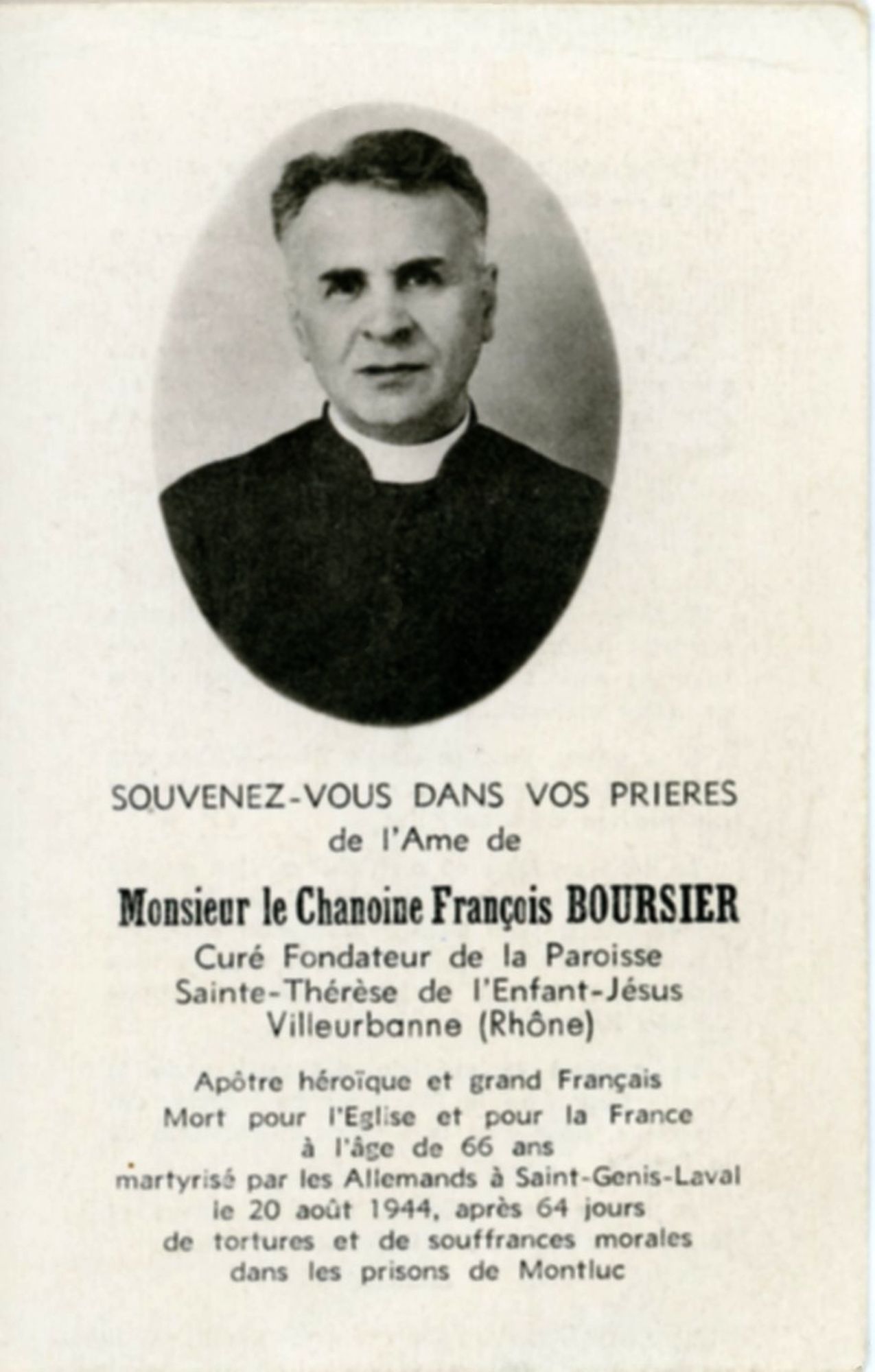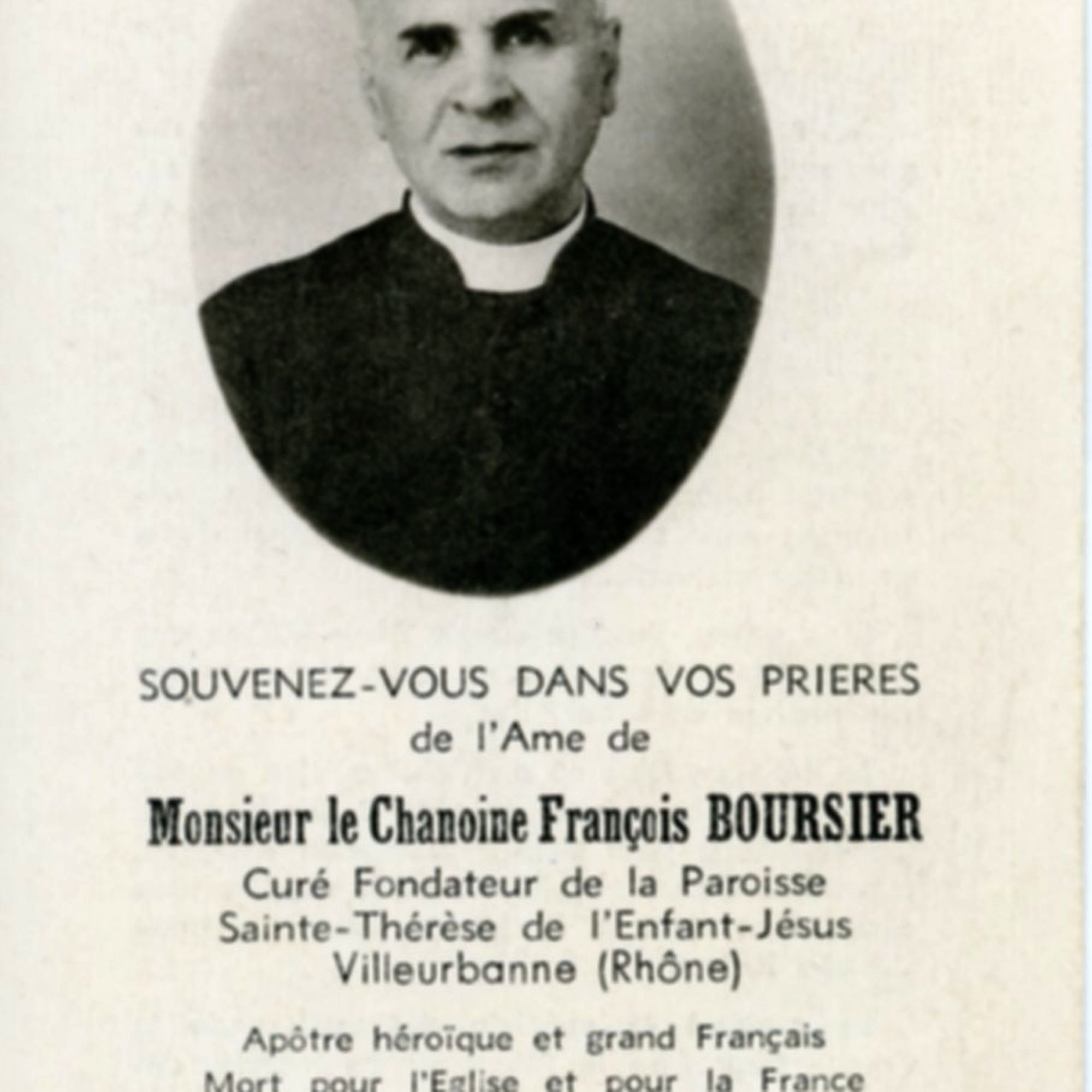 Figure emblématique de l'histoire religieuse de Villeurbanne, le chanoine François Boursier est le curé-fondateur de la paroisse Sainte-Thérèse et participe activement aux mouvements de Résistance durant l'Occupation, jusqu'à son arrestation le 16 juin 1944 et son exécution par les Nazis le 20 août 1944.