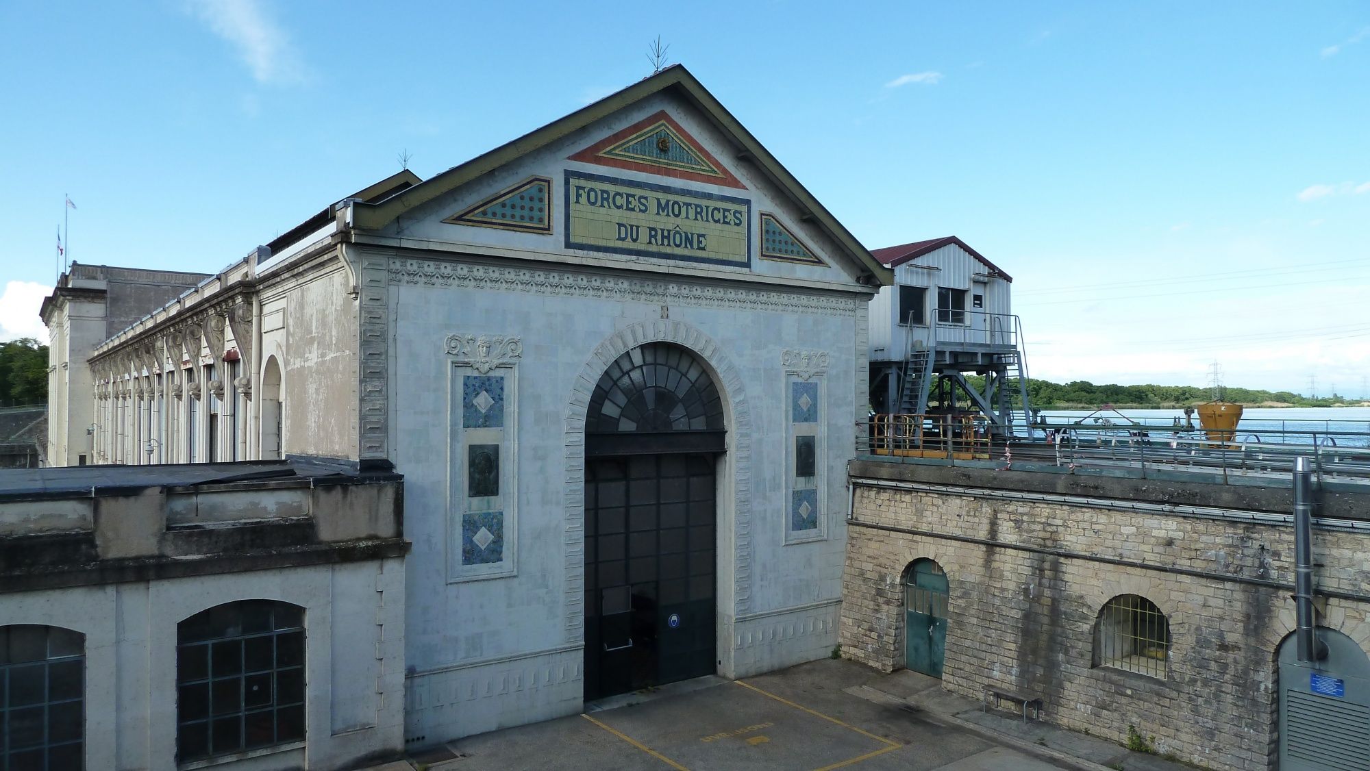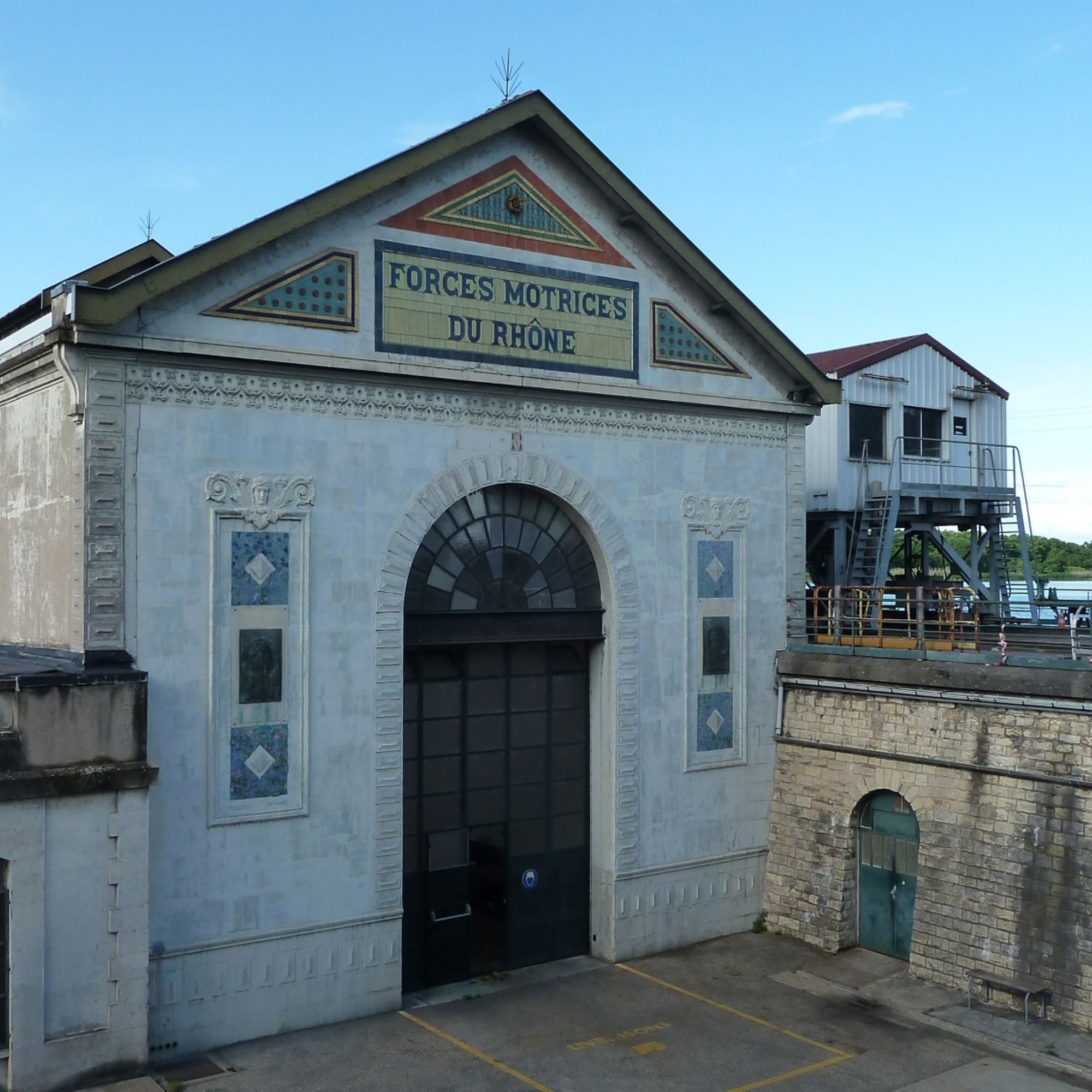 L’entrée de l’usine s’effectue par la façade sud qui présente un riche décor en céramiques colorées élaboré par l’entreprise Sautier-Thyrion et Mouton. Le fronton comporte l’enseigne des Forces Motrices du Rhône et la porte est encadrée par deux bronzes en semi-méplat, réalisés par le sculpteur lyonnais Jean Chorel (1875-1946). Il exécute l’effigie des deux protagonistes du projet, Joseph-Alphonse Henry à l’ouest et Jean-François Raclet à l’est. Le bâtiment adopte une composition régulière et esthétique qui montre la volonté de faire participer l’architecture à la mise en valeur du lieu.