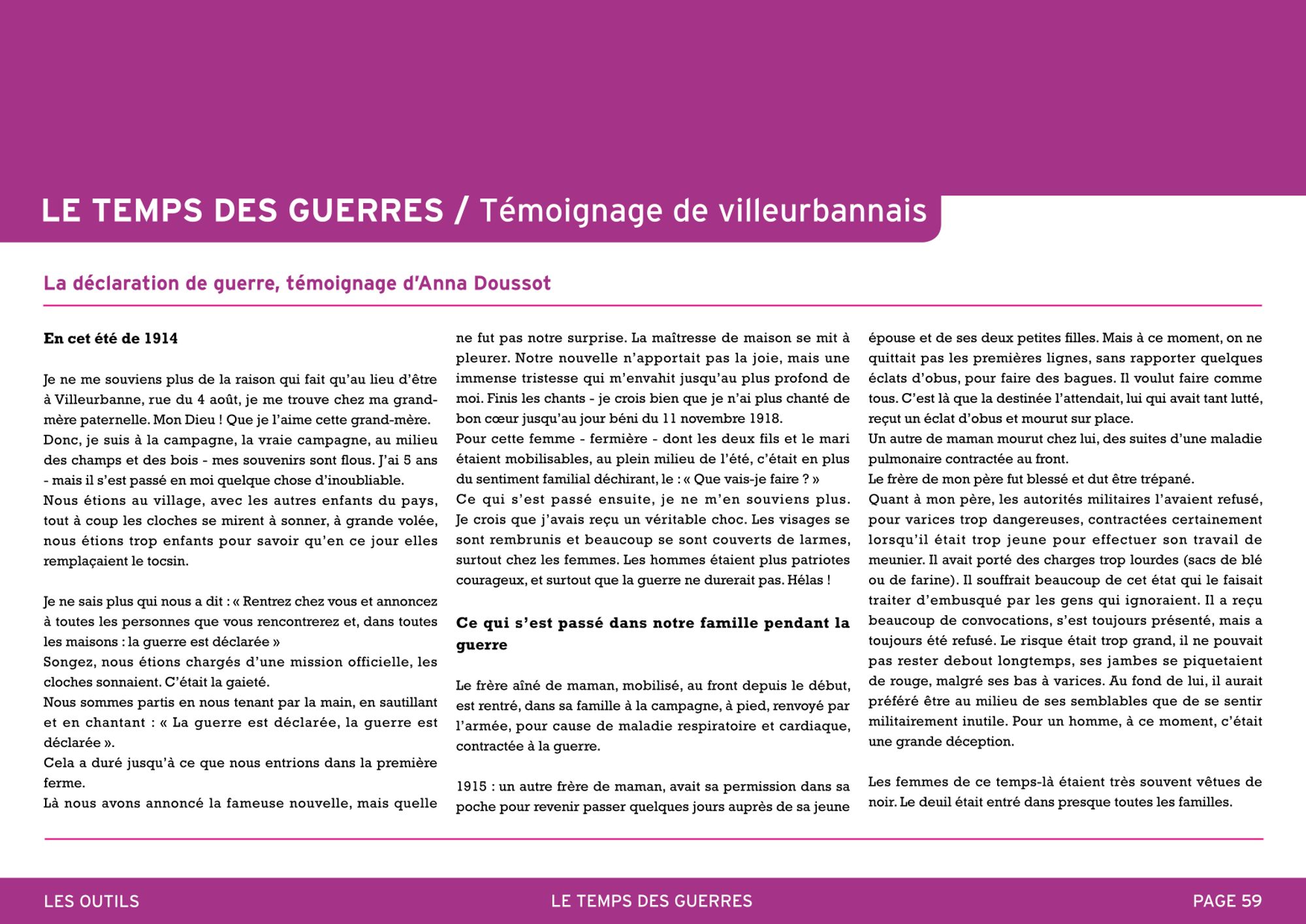 Anna Doussot est âgée lorsqu’elle rassemble ses souvenirs sur la première guerre mondiale. Elle dit avoir 5 ans en 1914 au moment où la guerre est déclarée et donc 8 ans lorsqu’elle s’achève. Les souvenirs personnels qu’elle peut avoir conservés de l’évènement ne peuvent qu’être fugaces et limités. Elle rapporte aussi ce qu’on lui a raconté dans sa famille sur l’événement. Ce témoignage nous renseigne aussi sur les conséquences de la guerre dans une famille villeurbannaise. Une réflexion peut s’engager avec les élèves sur le thème des récits de mémoire et de leur nature avec les limites de ce type de source.