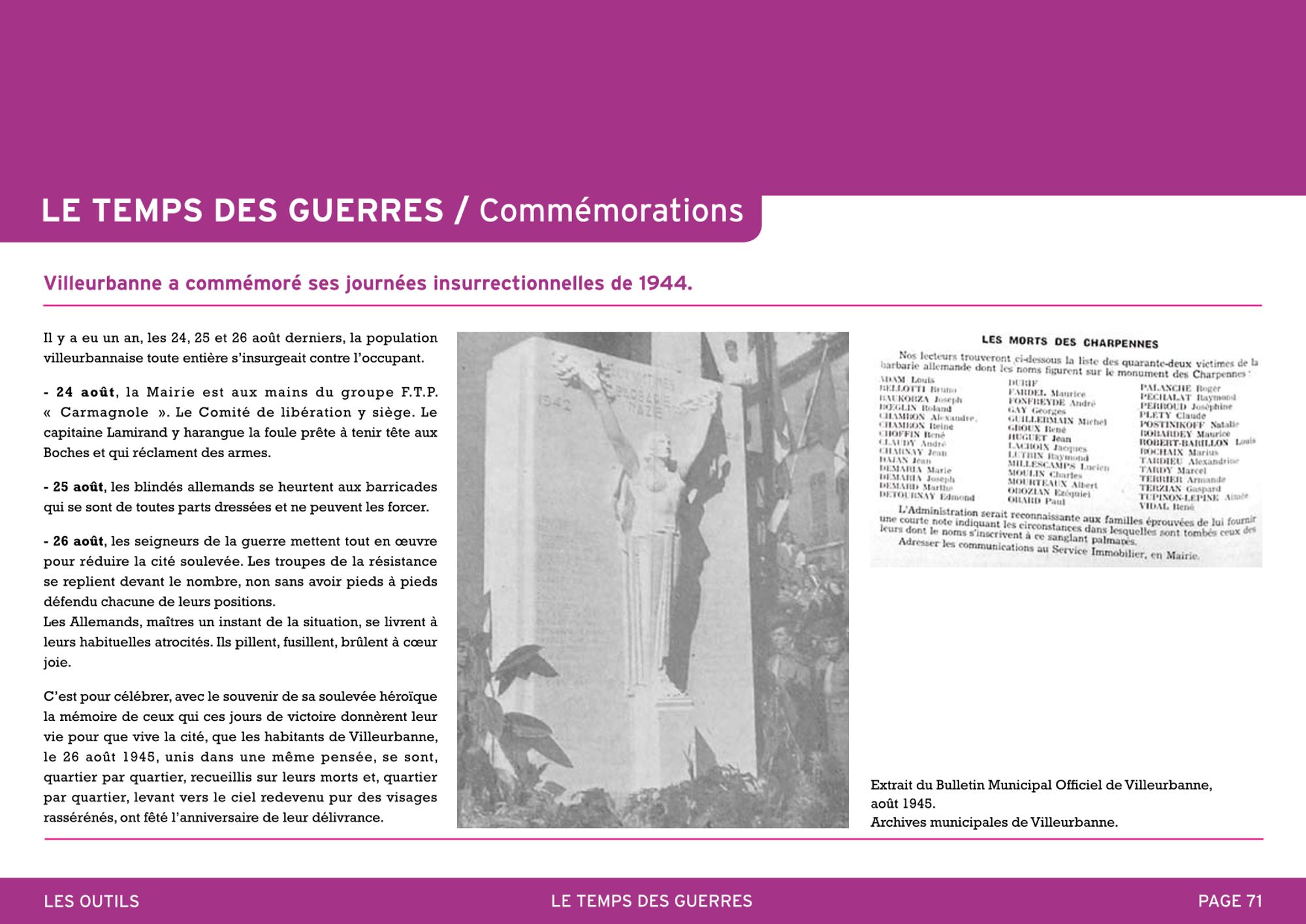 C’est pour célébrer, avec le souvenir de sa soulevée héroïque la mémoire de ceux qui ces jours de victoire donnèrent leur vie pour que vive la cité, que les habitants de Villeurbanne, le 26 août 1945, unis dans une même pensée, se sont, quartier par quartier, recueillis sur leurs morts et, quartier par quartier, levant vers le ciel redevenu pur des visages rassérénés, ont fêté l’anniversaire de leur délivrance.