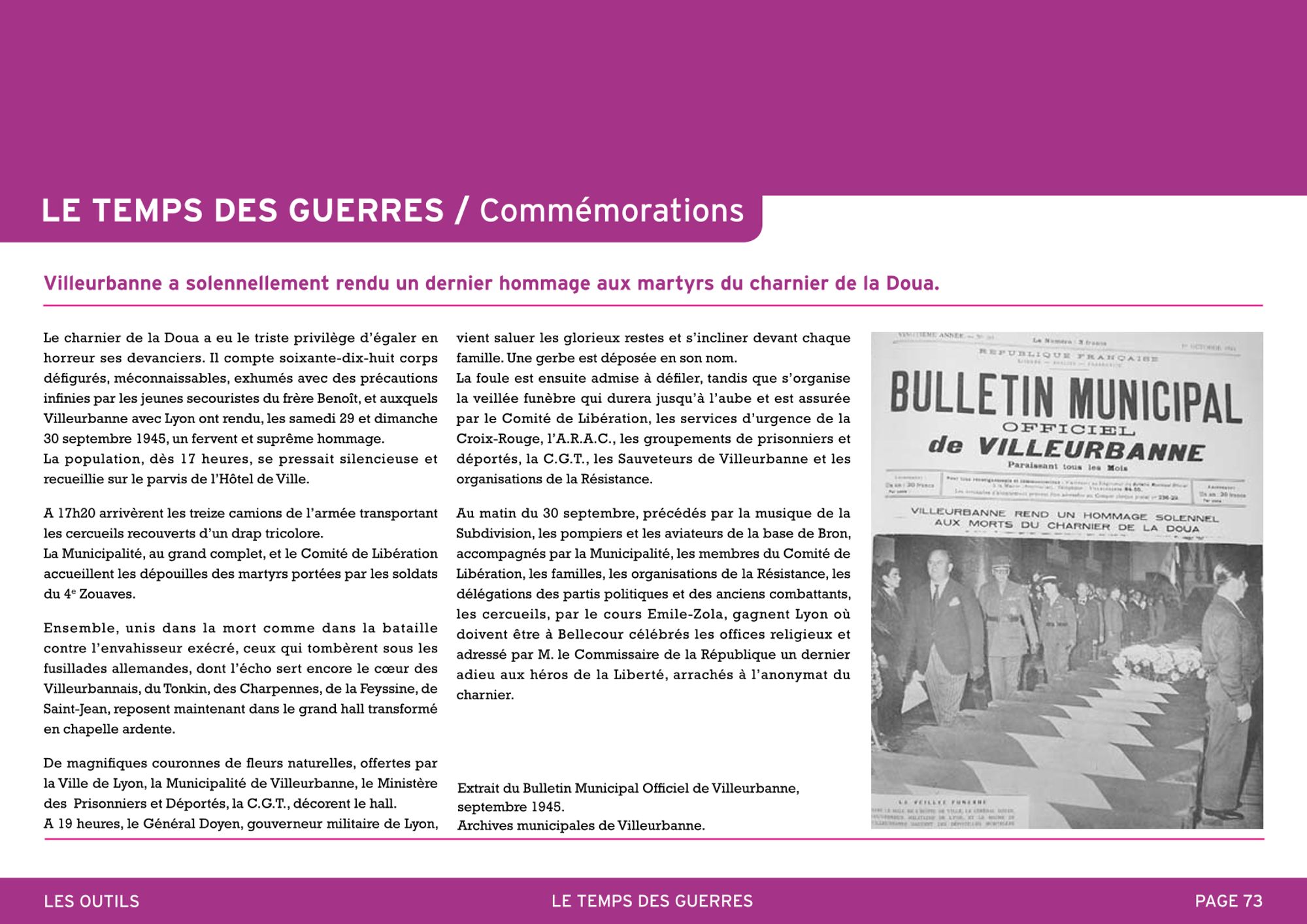 Le charnier de la Doua a eu le triste privilège d’égaler en horreur ses devanciers. Il compte soixante-dix-huit corps défigurés, méconnaissables, exhumés avec des précautions infinies par les jeunes secouristes du frère Benoît, et auxquels Villeurbanne avec Lyon ont rendu, les samedi 29 et dimanche 30 septembre 1945, un fervent et suprême hommage.