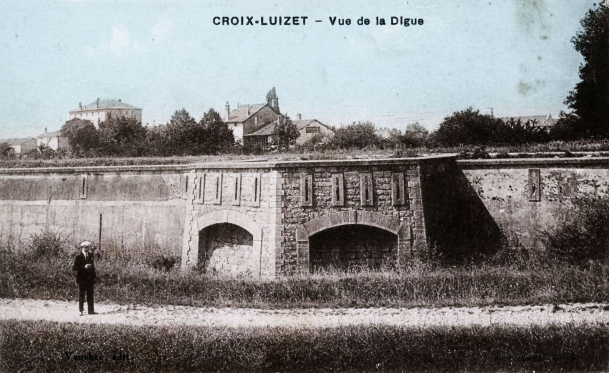 Cusset, vue de la digue. Carte postale colorisée d'après photographie. Archives municipales de Villeurbanne / le Rize, 2 Fi 592.