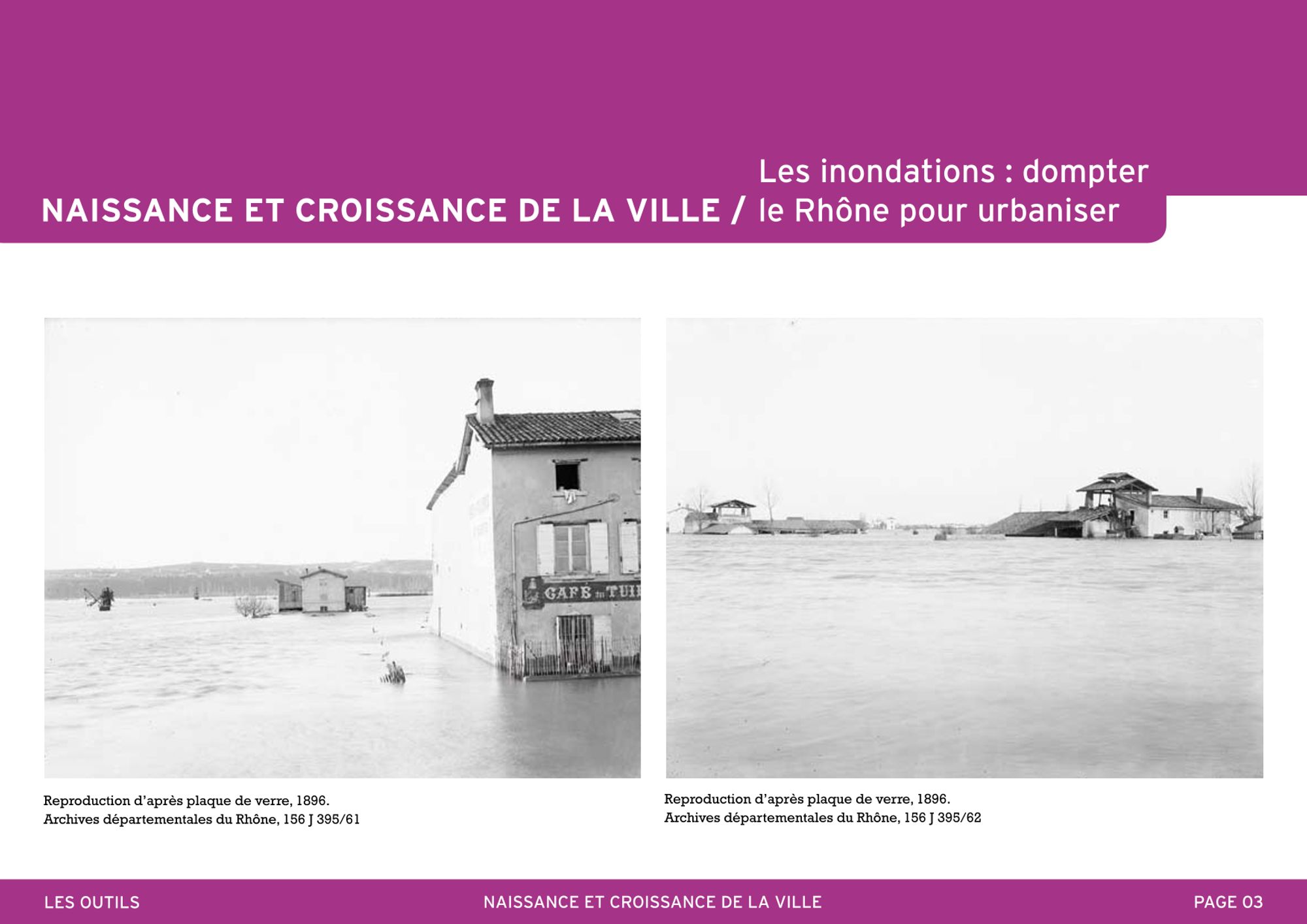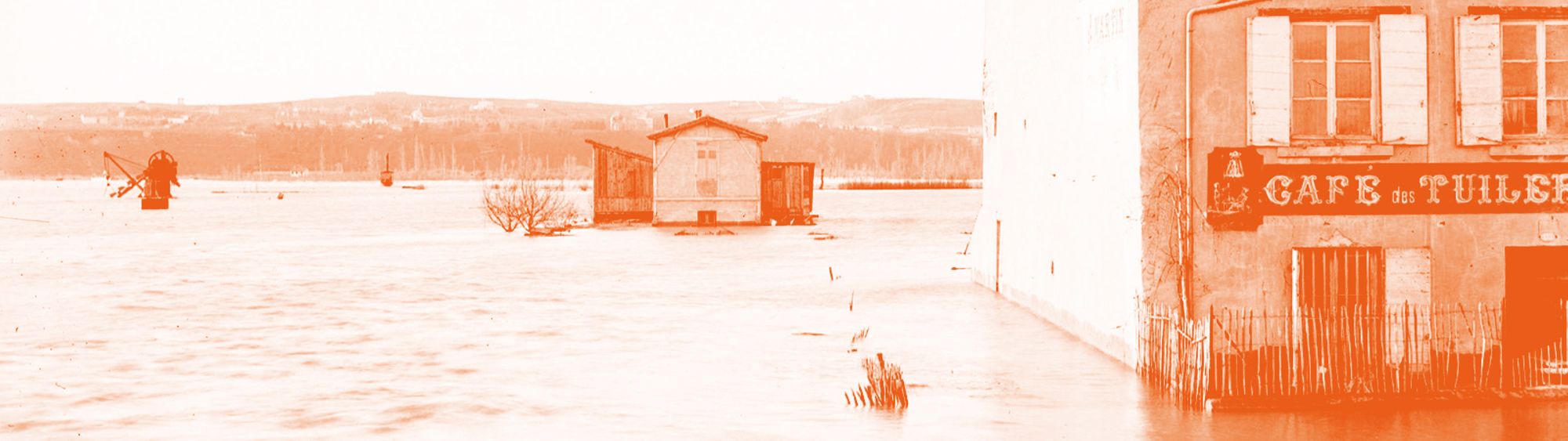 D’autres inondations ravagent le territoire villeurbannais. Les photographies de 1896 montrent l’une des inondations qui a perturbé la construction du canal de Jonage et de l’usine de Cusset.