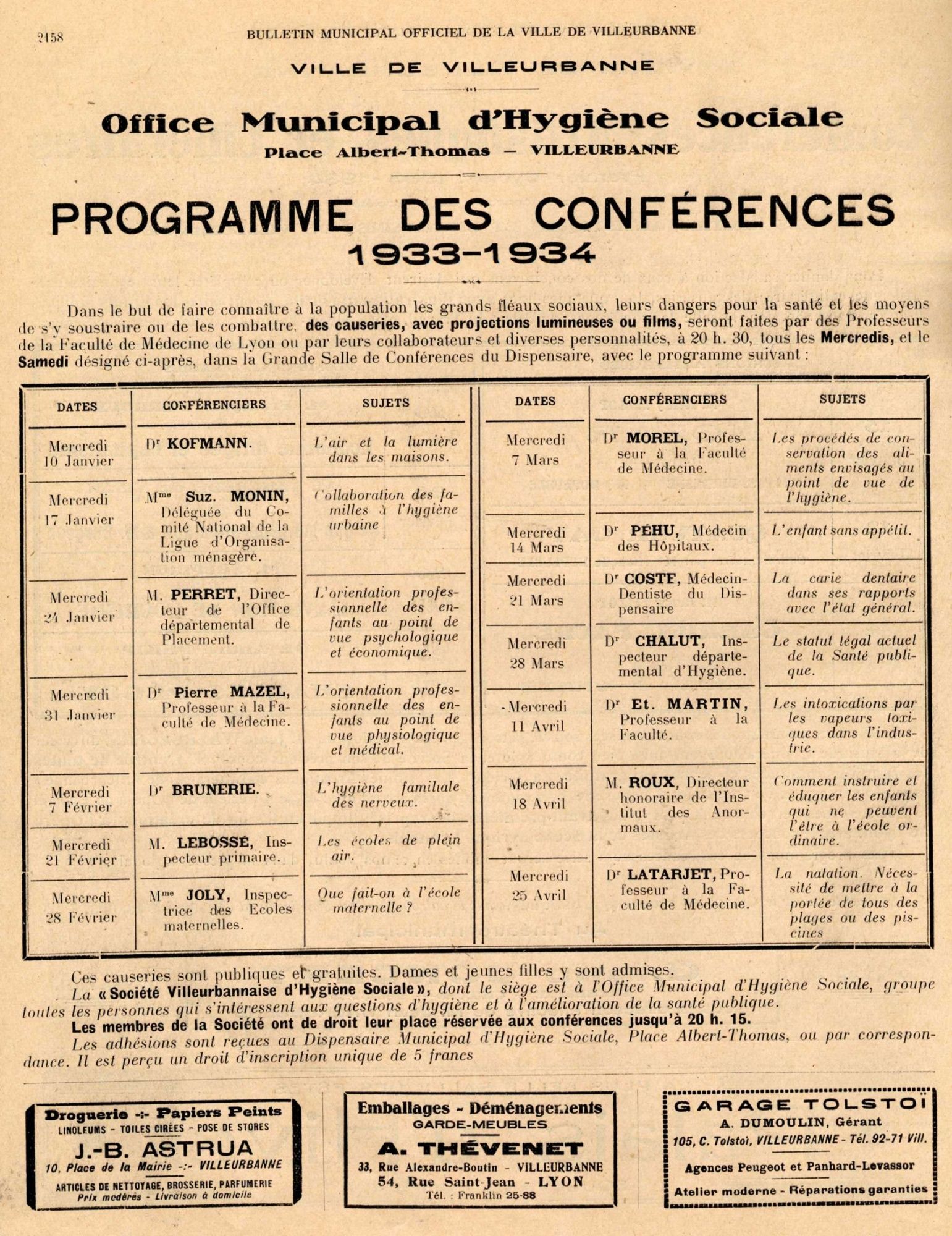 Pour la municipalité socialiste, il s’agit de donner à la population ouvrière villeurbannaise des équipements sociaux et culturels. L’aile gauche du bâtiment abrite un dispensaire et un bureau d’hygiène, équipements excessivement importants pour améliorer l’état sanitaire d’une population ouvrière pour laquelle l’accès aux soins de santé n’est pas facile. Les préoccupations hygiénistes du docteur Lazare Goujon sont à noter. L’aile droite comprend des salles de réunions pour les sociétés mais aussi pour les syndicats.